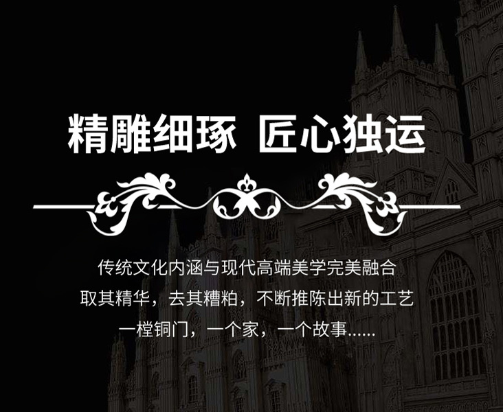 沈陽銅門制造公司擁有獨立、完整、雄厚的研發和生產能力,先進齊全的銅門生產、加工設備,集材料、設計、生產、安裝、服務一體化。我們生產的系列豪華銅門:防盜、防火、防爆、靜音、環保,選用99.99%高純度的專用銅門材料,內襯優質鍍鋅鋼管焊接的網狀骨架,兩面覆蓋高強度鍍鋅鋼板,外表處理采用進口材料與先進工藝,使其著色自然、光亮、恒久,在豪華氣質之上更添光彩。我們以精湛的工藝、完善的售后服務體系,獲得了客戶的一致好評。